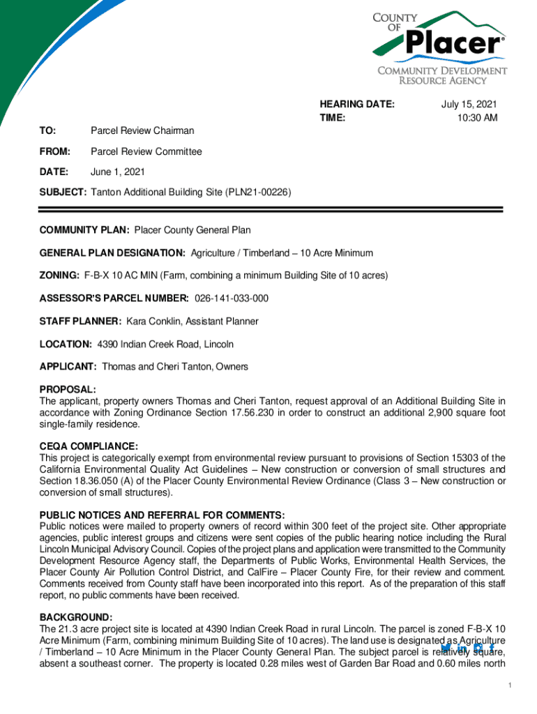 HEARING DATE: TIME: TO:Parcel Review ChairmanFROM:Parcel Review Committeeman:June 1, 2021July 15, 2021 10:30 SUBJECT: Canton Additional Building Site (PLN2100226)COMMUNITY PLAN: Placer County General
