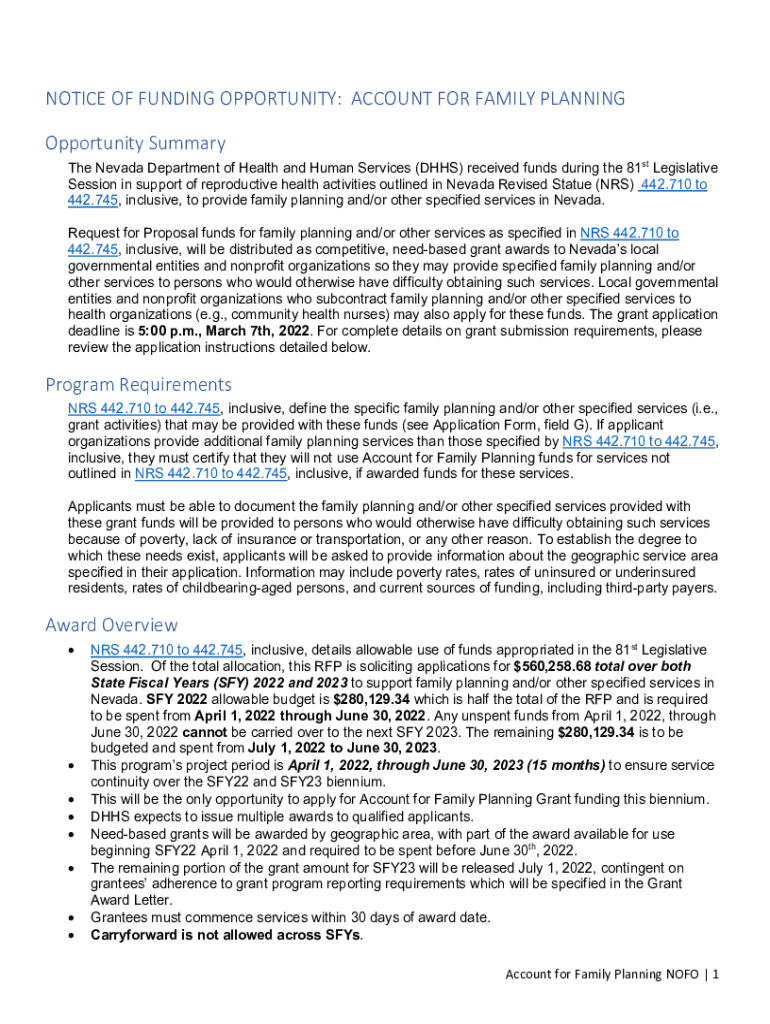 NOTICE OF FUNDING OPPORTUNITY: ACCOUNT FOR FAMILY PLANNING Opportunity Summary The Nevada Department of Health and Human Services (HHS) received funds during the 81st Legislative Session in support