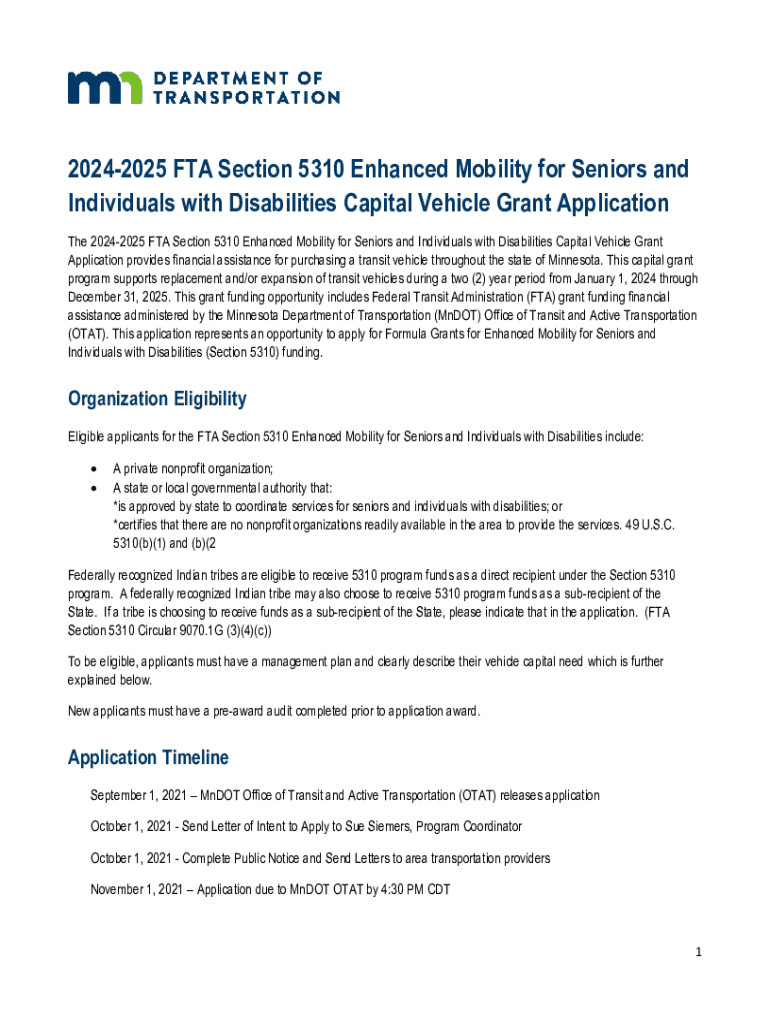 20242025 FTA Section 5310 Enhanced Mobility for Seniors and Individuals with Disabilities Capital Vehicle Grant Application The 20242025 FTA Section 5310 Enhanced Mobility for Seniors and Individuals