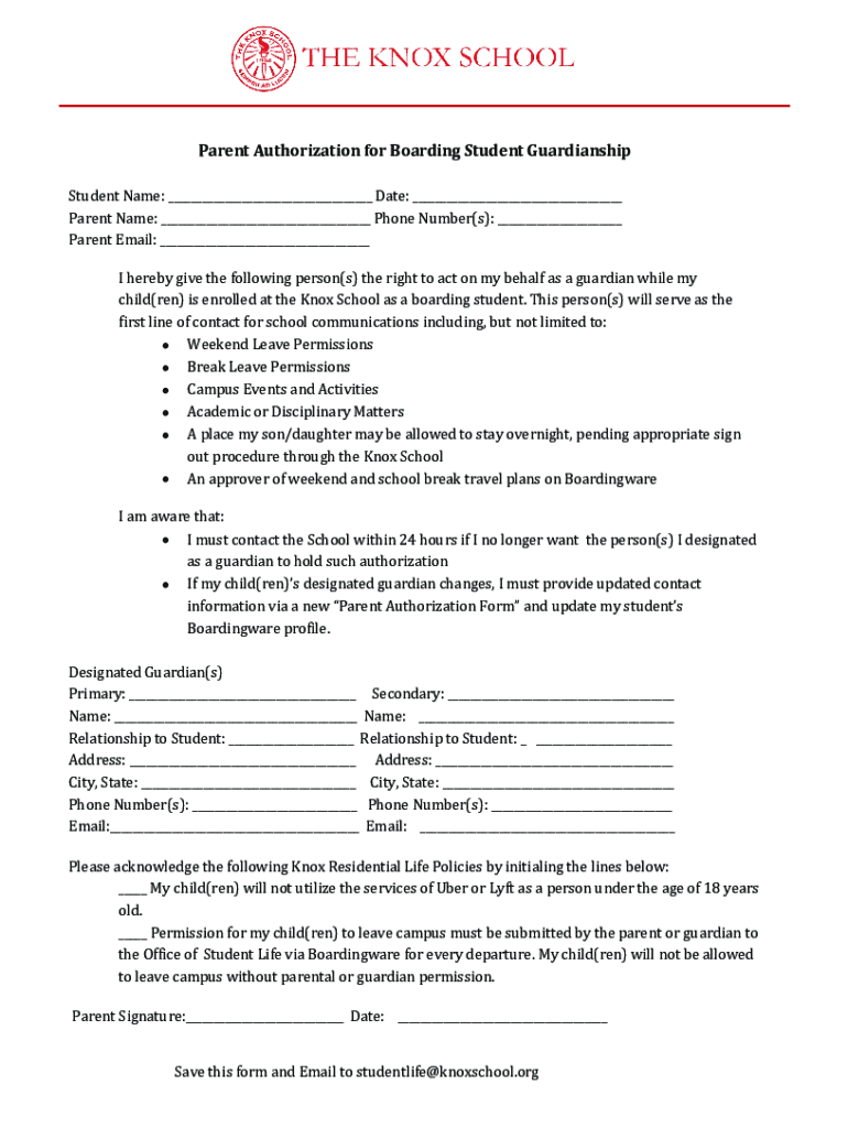 Parent Authorization for Boarding Student Guardianship Student Name: ___ Date: ___ Parent Name: ___ Phone Number(s): ___ Parent Email: ___I hereby give the following person(s) the right to act on