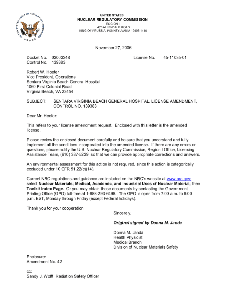 UNITED STATESNUCLEAR REGULATORY COMMISSION REGION I 475 ALLENDALE ROAD KING OF PRUSSIA, PENNSYLVANIA 194061415November 27, 2006 Docket No. Control No.03003348 139383License No.451103501Robert W. Hoofer