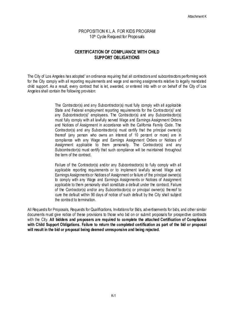 Attachment PROPOSITION K L.A. FOR KIDS PROGRAM 10th Cycle Request for Proposals CERTIFICATION OF COMPLIANCE WITH CHILD SUPPORT Obligations City of Los Angeles has adopted\' an ordinance requiring