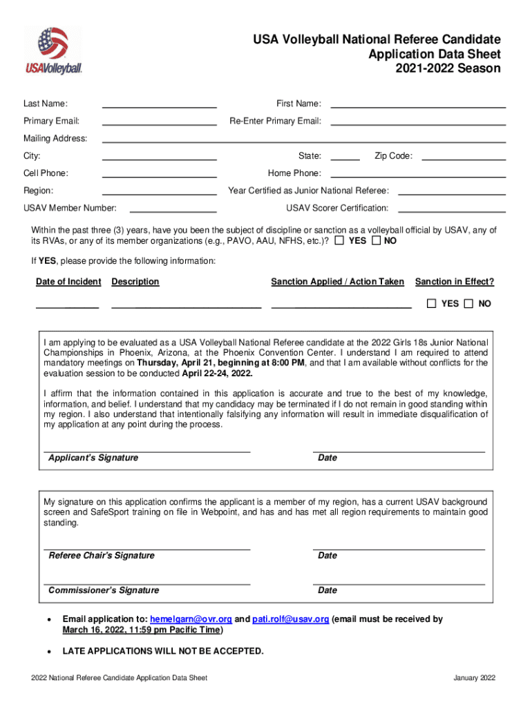 USA Volleyball National Referee Candidate Application Data Sheet 20212022 Season Last Name:First Name:Primary Email:Reenter Primary Email:Mailing Address: City:State:Cell Phone:Zip Code:Home Phone:Region:Year