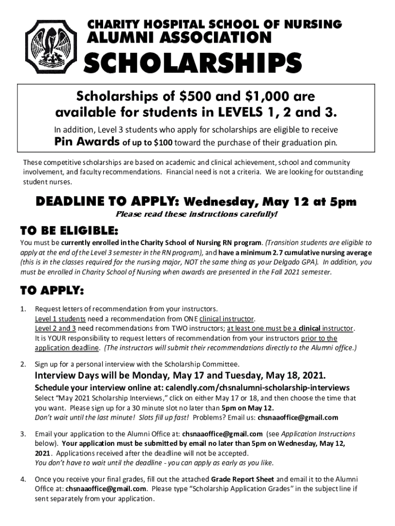 CHARITY HOSPITAL SCHOOL OF NURSINGALUMNI ASSOCIATIONSCHOLARSHIPS Scholarships of $500 and $1,000 are available for students in LEVELS 1, 2 and 3. In addition, Level 3 students who apply for scholarships