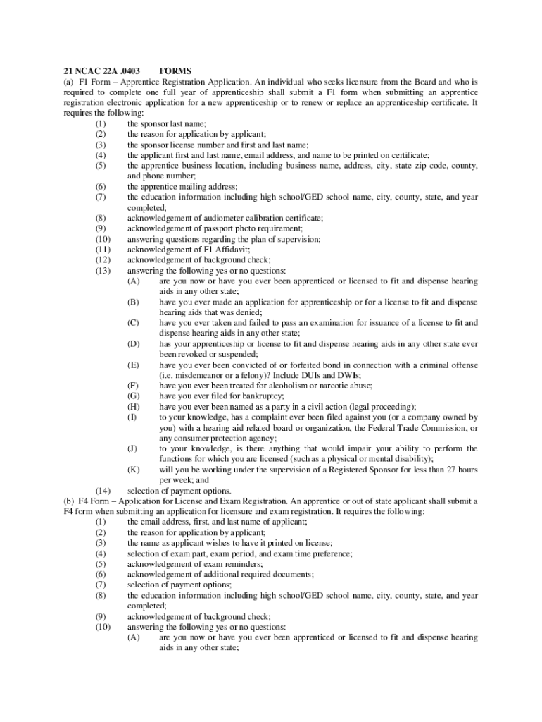 21 NCAA 22A .0403 FORMS (a) F1 Form Apprentice Registration Application. An individual who seeks licensure from the Board and who is required to complete one full year of apprenticeship shall submit