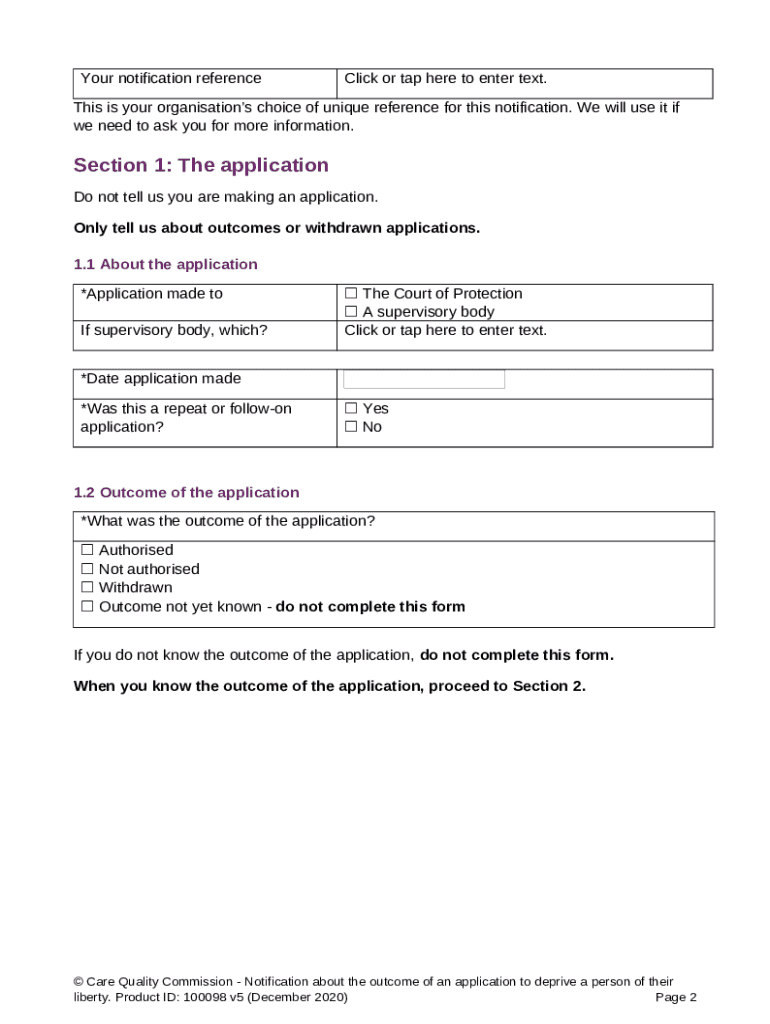 Instructions for the form Notification about the outcome of an application toNotification about the outcome of an application toDoLS notificationCare Quality CommissionNotification - person - care home