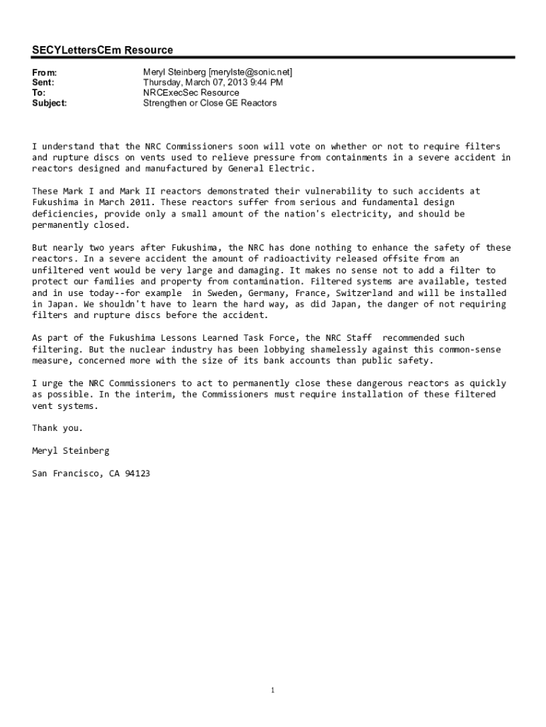 SECYLettersCEm Resource From: Sent: To: Subject:Beryl Steinberg [merylste@sonic.net] Thursday, March 07, 2013 9:44 PM NRCExecSec Resource Strengthen or Close GE Reactors understand that the NRC Commissioners