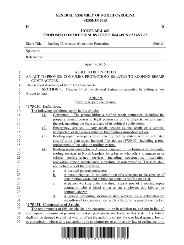 GENERAL ASSEMBLY OF NORTH CAROLINA SESSION 2015 HD HOUSE BILL 643 PROPOSED COMMITTEE SUBSTITUTE H643PCS30333ST22Short Title:Roofing Contractors/Consumer Protection.(Public)Sponsors: Referred to: April