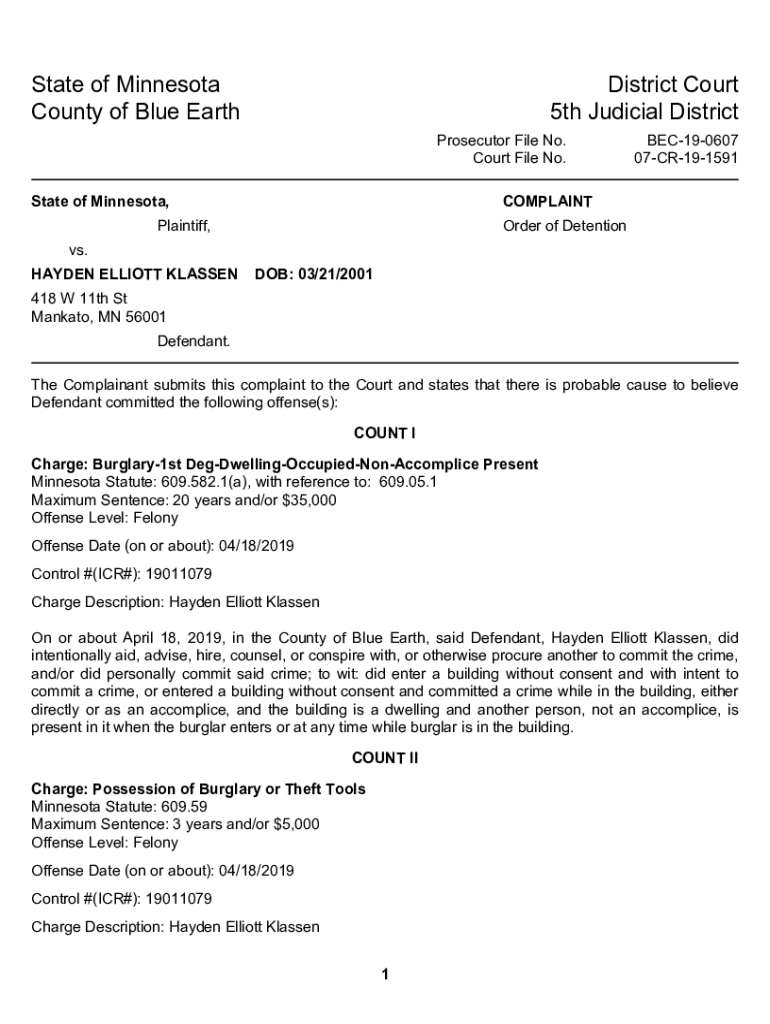 StateofMinnesota CountyofBlueEarthDistrictCourt 5thJudicialDistrict ProsecutorFileNo. CourtFileNo. StateofMinnesota,BEC190607 07CR191591COMPLAINTPlaintiff,OrderofDetentionvs. HAYDENELLIOTTKLASSENDOB:03/21/2001