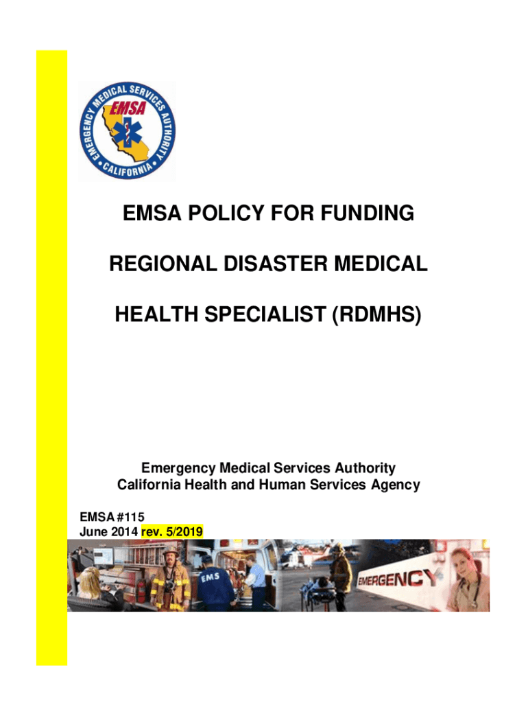 EMMA POLICY FOR FUNDING REGIONAL DISASTER MEDICAL HEALTH SPECIALIST (RDM HS)Emergency Medical Services Authority California Health and Human Services Agency EMMA #115 June 2014 rev. 5/2019FUNDING