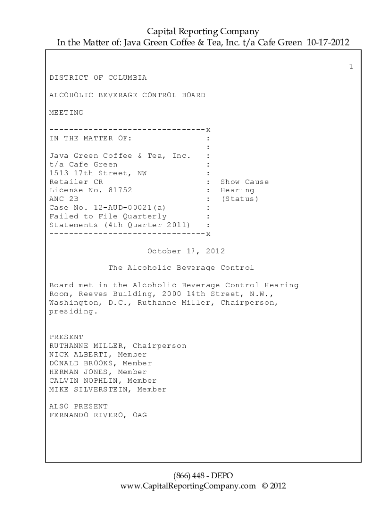 Capital Reporting Company In the Matter of: Java Green Coffee & Tea, Inc. t/a Café Green 10172012 1 DISTRICT OF COLUMBIA ALCOHOLIC BEVERAGE CONTROL BOARD MEETING x IN THE MATTER OF: : : Java Green