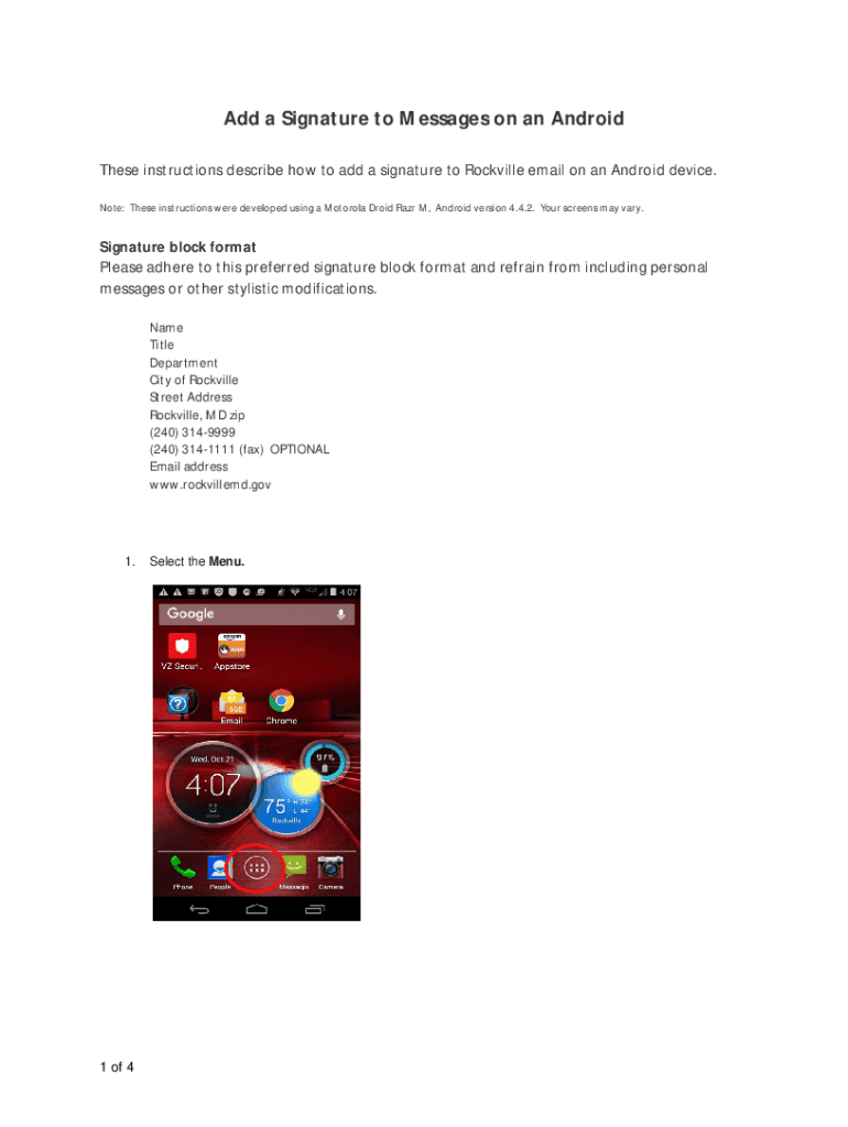 Add a Signature to Messages on an Android These instructions describe how to add a signature to Rockville email on an Android device. Note: These instructions were developed using a Motorola Droid