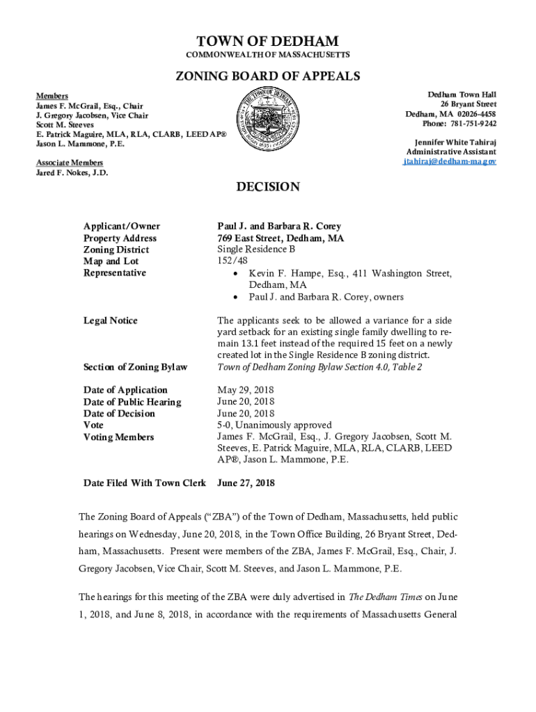 TOWN OF DURHAM COMMONWEALTH OF MASSACHUSETTSZONING BOARD OF APPEALS Durham Town Hall 26 Bryant Street Durham, MA 020264458 Phone: 7817519242Members James F. Grail, Esq., Chair J. Gregory Jacobsen,