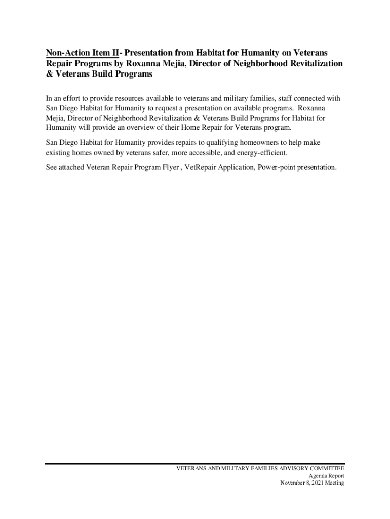 Donation Item II Presentation from Habitat for Humanity on Veterans Repair Programs by Roxanne Mejia, Director of Neighborhood Revitalization & Veterans Build Programs In an effort to provide resources