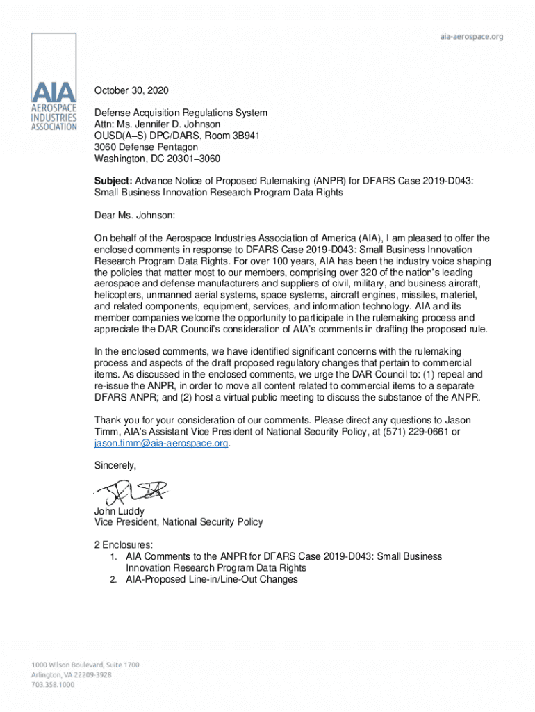 October 30, 2020, Defense Acquisition Regulations System Attn: Ms. Jennifer D. Johnson OUST(AS) DPC/DAYS, Room 3B941 3060 Defense Pentagon Washington, DC 203013060 Subject: Advance Notice of Proposed
