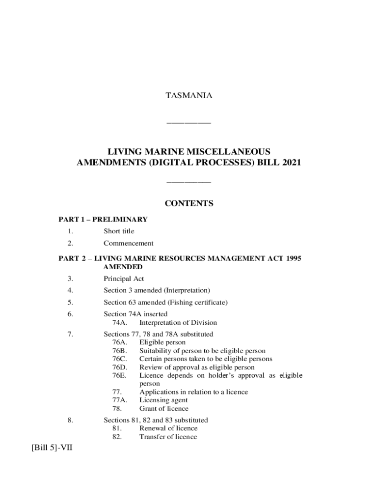 TASMANIA ___LIVING MARINE MISCELLANEOUS AMENDMENTS (DIGITAL PROCESSES) BILL 2021 ___ CONTENTS PART 1 PRELIMINARY 1. Short title2. CommencementPART 2 LIVING MARINE RESOURCES MANAGEMENT ACT 1995 AMENDED