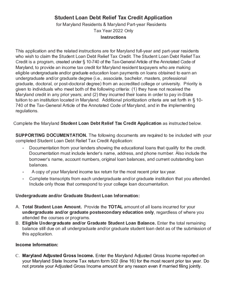 Student Loan Debt Relief Tax Credit Application for Maryland Residents & Maryland Part year Residents Tax Year 2022 Only InstructionsThis application and the related instructions are for Maryland