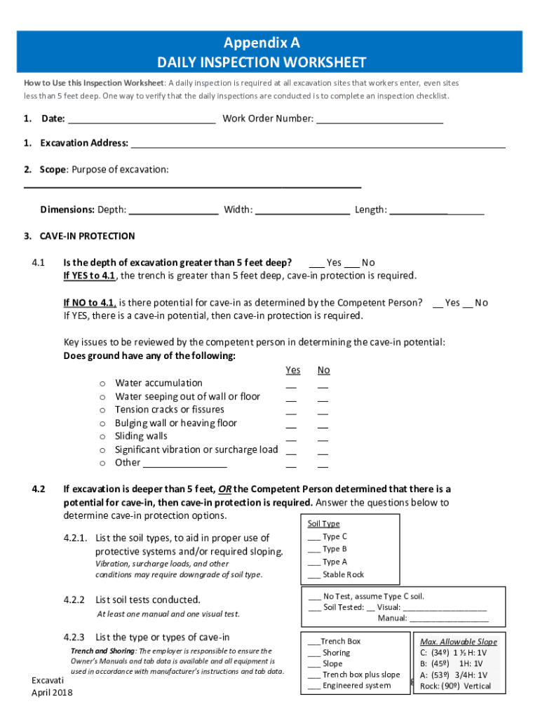 Appendix A DAILY INSPECTION WORKSHEET How to Use this Inspection Worksheet: A daily inspection is required at all excavation sites that workers enter, even sites less than 5 feet deep. One way to