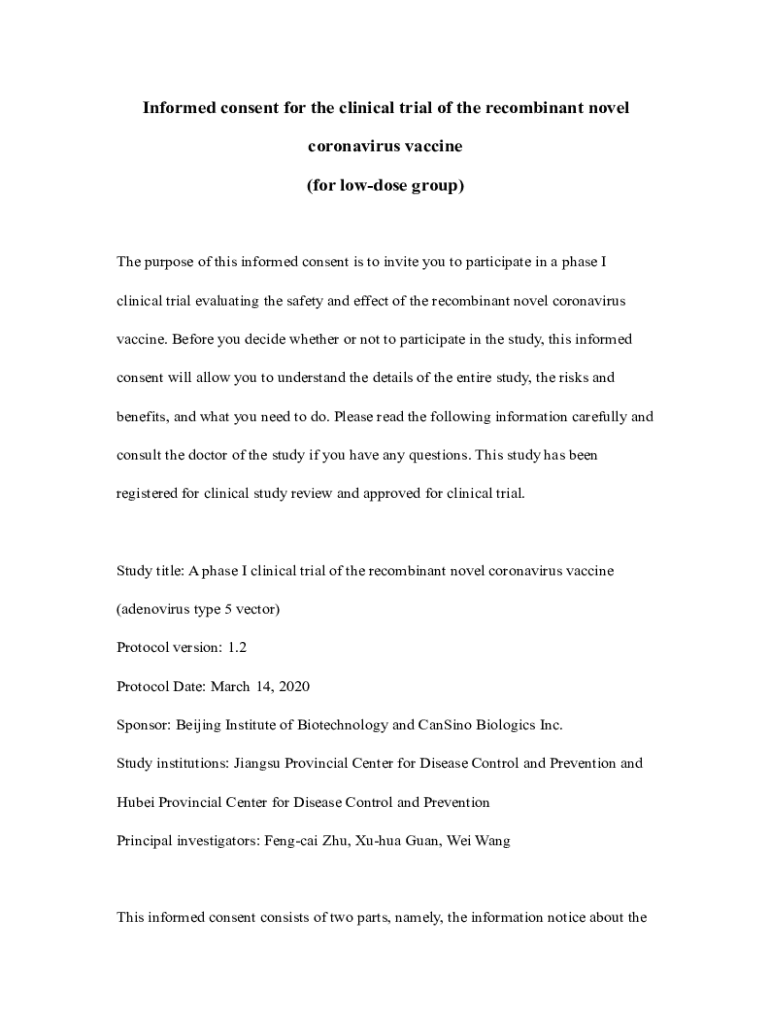Informed consent for the clinical trial of the recombinant novel coronavirus vaccine (for low dose group)The purpose of this informed consent is to invite you to participate in a phase I clinical