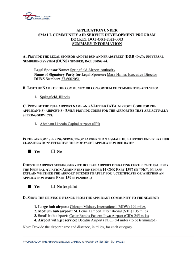 APPLICATION UNDER SMALL COMMUNITY AIR SERVICE DEVELOPMENT PROGRAM DOCKET DOTOST20220003 SUMMARY INFORMATION A. PROVIDE THE LEGAL SPONSOR AND ITS DUN AND BRADSTREET (D&B) DATA UNIVERSAL NUMBERING SYSTEM
