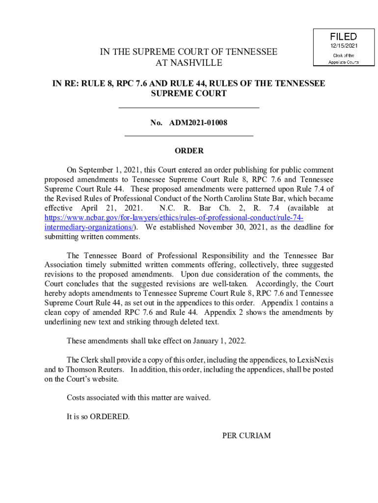 IN THE SUPREME COURT OF TENNESSEE AT NASHVILLE12/15/2021IN RE: RULE 8, RPC 7.6 AND RULE 44, RULES OF THE TENNESSEE SUPREME COURT ___ No. ADM202101008 ___ ORDER On September 1, 2021, this Court entered
