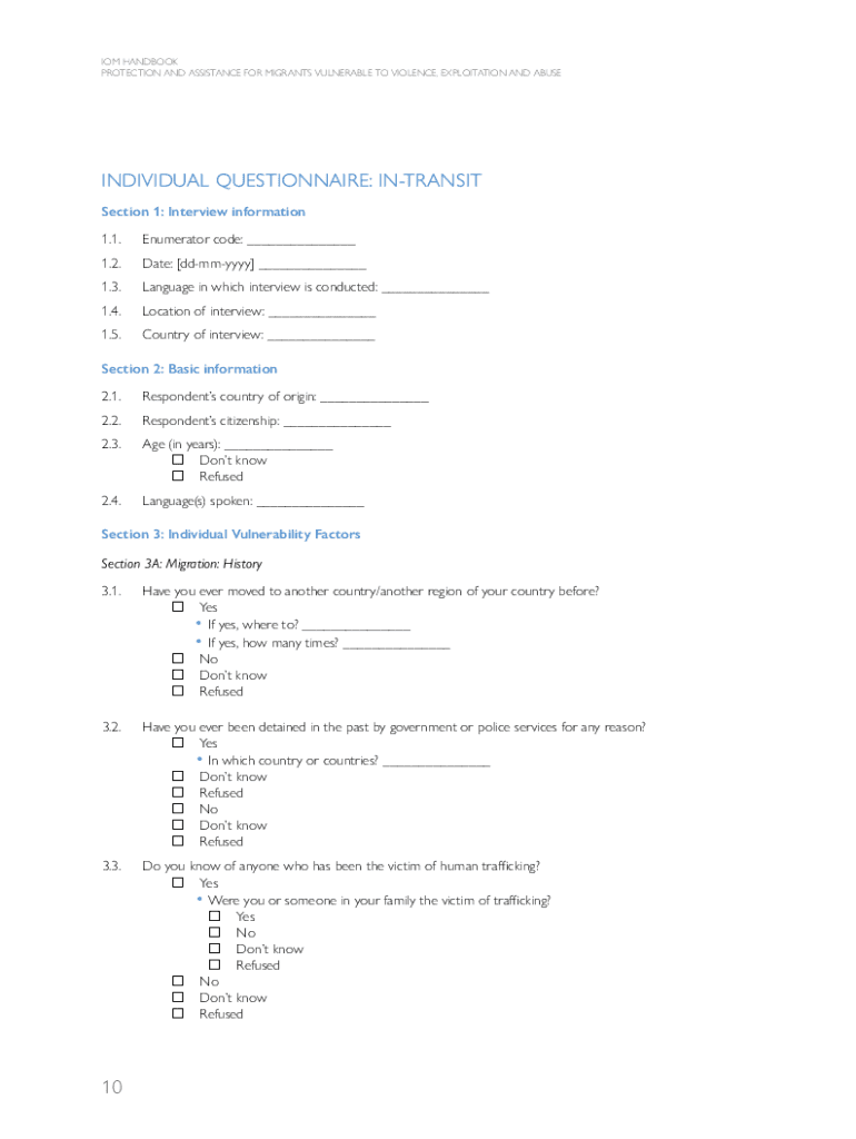 IOM HANDBOOK PROTECTION AND ASSISTANCE FOR MIGRANTS VULNERABLE TO VIOLENCE, EXPLOITATION AND ABUSEINDIVIDUAL QUESTIONNAIRE: INTRANS IT Section 1: Interview information 1.1. Enumerator code: ___1.2.