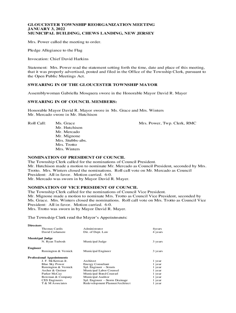 GLOUCESTER TOWNSHIP REORGANIZATION MEETING JANUARY 3, 2022, MUNICIPAL BUILDING, CHEWS LANDING, NEW JERSEY Mrs. Power called the meeting to order. Pledge Allegiance to the Flag Invocation: Chief David
