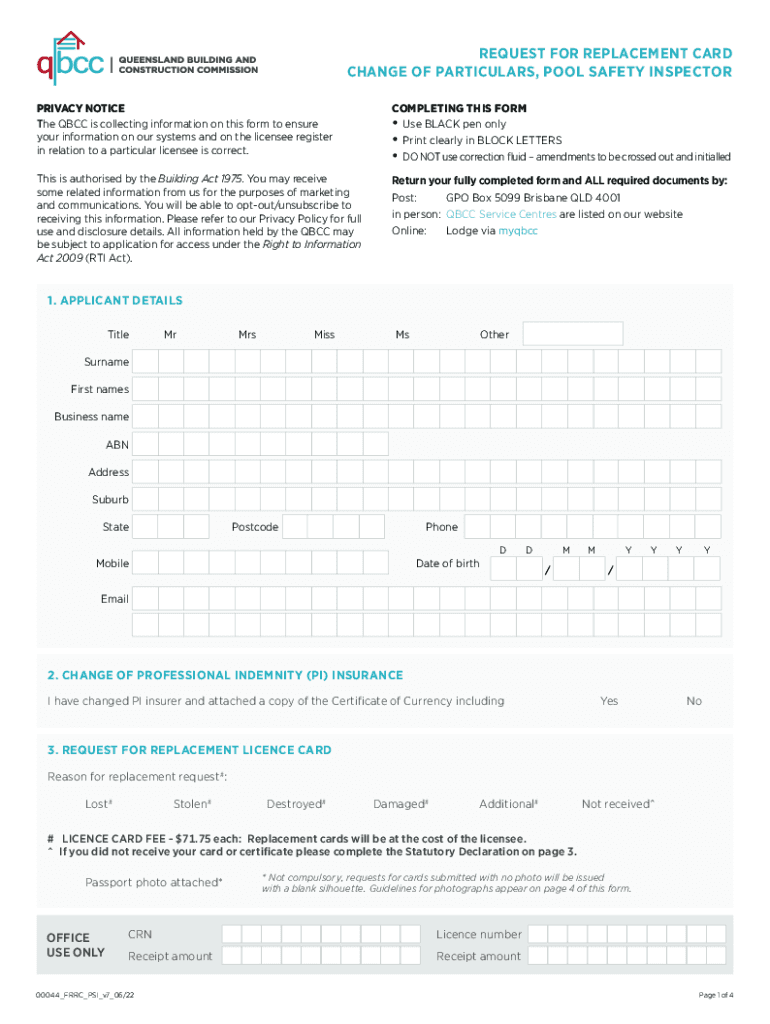 REQUEST FOR REPLACEMENT CARD CHANGE OF PARTICULARS, POOL SAFETY INSPECTOR PRIVACY NOTICE The BCC is collecting information on this form to ensure your information on our systems and on the licensee