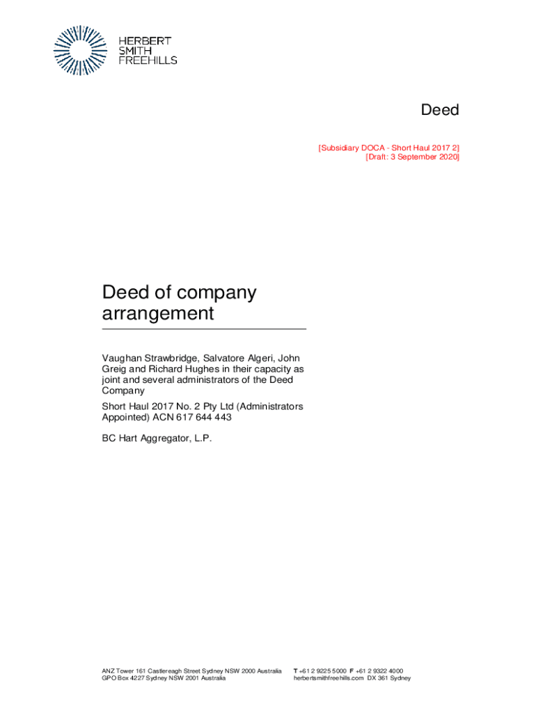 Deed [Subsidiary DOCK Short Haul 2017 2] [Draft: 3 September 2020]Deed of company arrangement Vaughan Straw bridge, Salvatore Algeria, John Drag and Richard Hughes in their capacity as joint and several