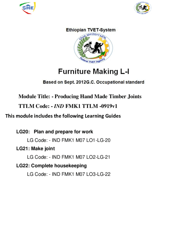 Module Title: Producing Hand Made Timber Joints TTL Code: IND FMK1 TTL 0919v1 This module includes the following Learning Guides LG20: Plan and prepare for work LG Code: IND FMK1 M07 LO1LG20 LG21: