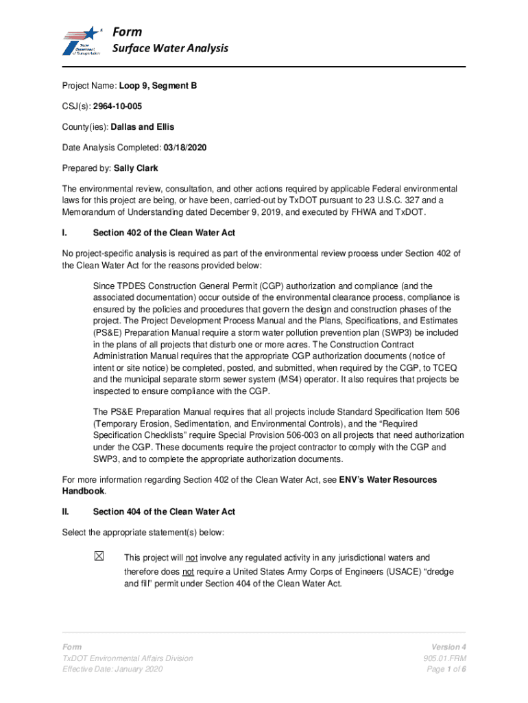 Resurface Water Analysis Project Name: Loop 9, Segment B CSS(s): 296410005 County(IES): Dallas and Ellis Date Analysis Completed: 03/18/2020 Prepared by: Sally Clark The environmental review, consultation,