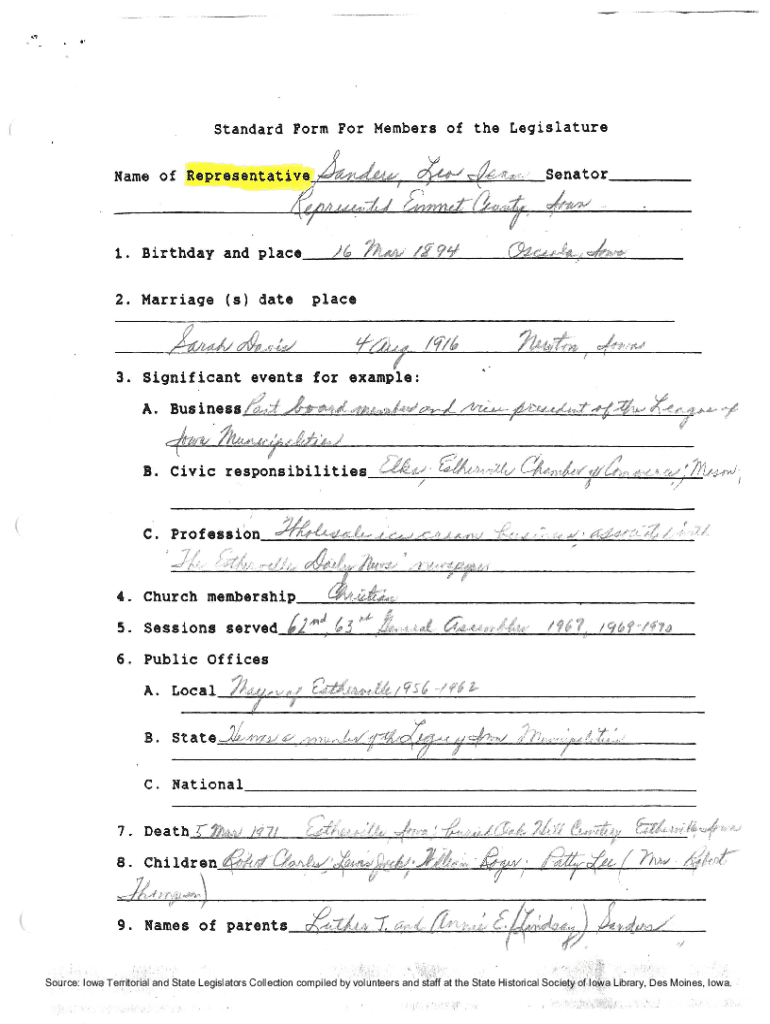 . Standard Form For Members of the Legislature Name of2. Marriage (s) dateplacef3. Significant events for example:A. Bus less, d:t A, \'TTU.rust, /4tt. P. M\'L.e...t4,.::f #. A/\” V ct\” 1. F+RV