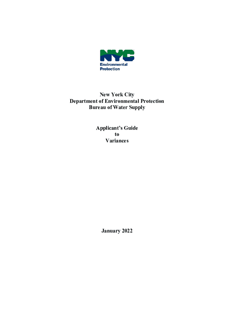 New York City Department of Environmental Protection Bureau of Water Supply Applicants Guide to Variances January 2022Applicants Guide to Variances TABLE OF CONTENTS SECTIONPAGE1.0INTRODUCTION ..................................................................................................................................