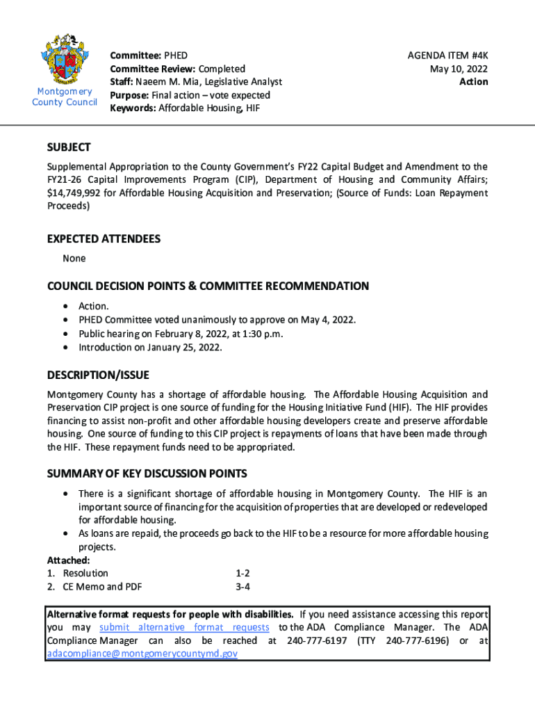 Montgomery County CouncilCommittee: PhD Committee Review: Completed Staff: Nae em M. Mia, Legislative Analyst Purpose: Final action vote expected Keywords: Affordable Housing, AGENDA ITEM #4K May
