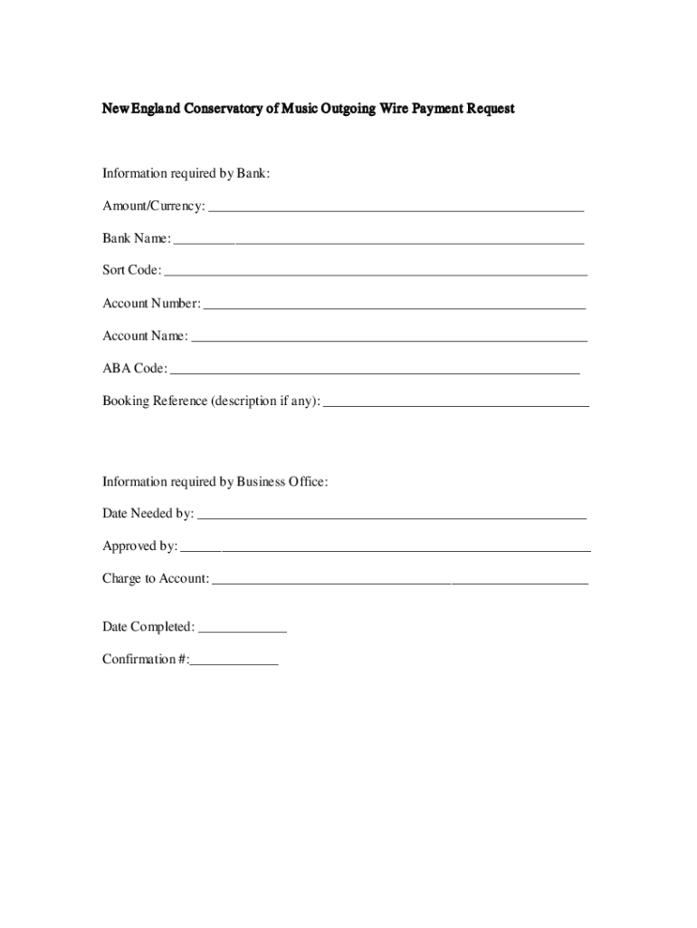 New England Conservatory of Music Outgoing Wire Payment RequestInformation required by Bank: Amount/Currency: ___ Bank Name: ___ Sort Code: ___ Account Number: ___ Account Name: ___ ABA Code: ___