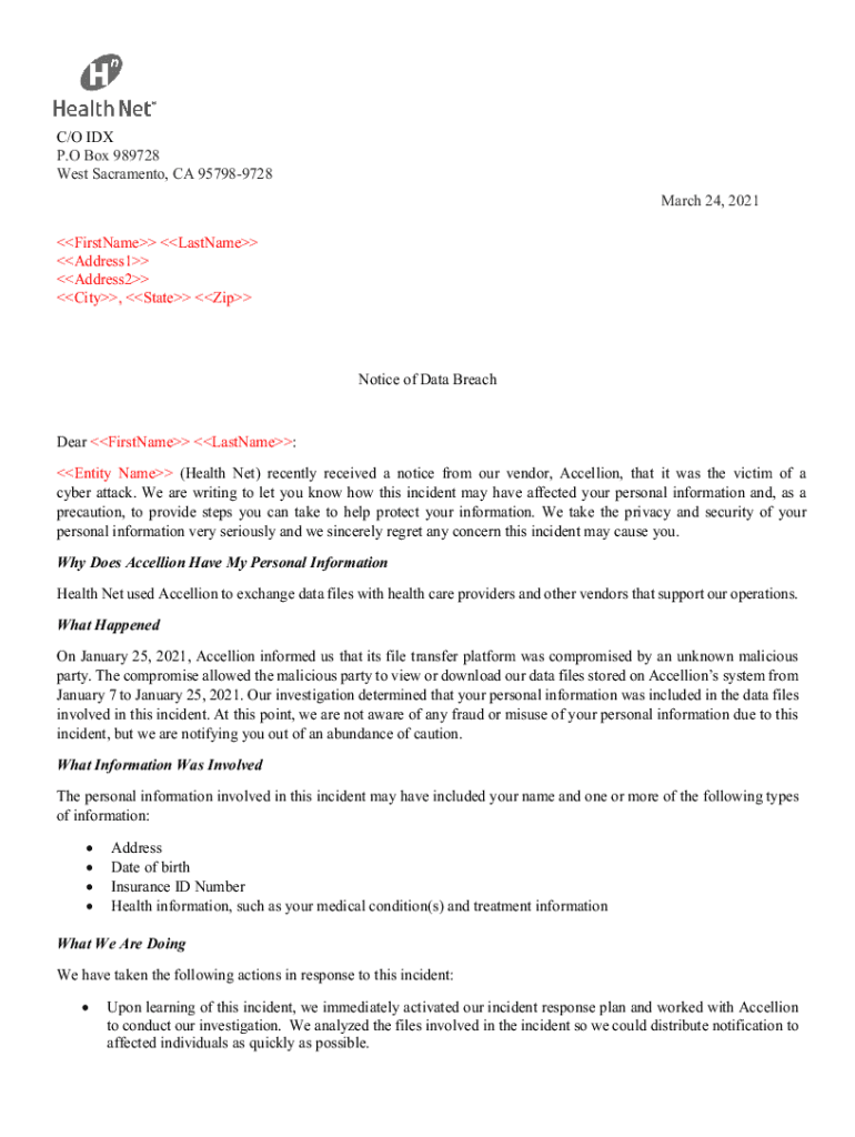 Get the free Health Net Life Insurance Company - Accellion Breach Notice Letter - oag ca
