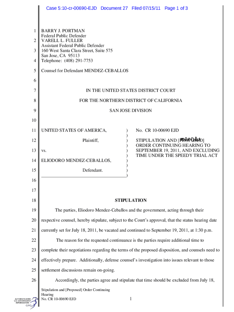 Case 5:10cr00690EJD Document 27 Filed 07/15/11-Page 1 of 314BARRY J. PORTMAN Federal Public Defender CARELL L. FULLER Assistant Federal Public Defender 160 West Santa Clara Street, Suite 575 San Jose,