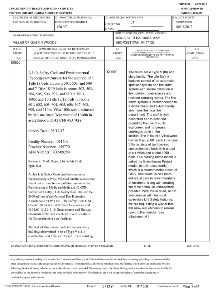 PRINTED: DEPARTMENT OF HEALTH AND HUMAN SERVICES CENTERS FOR MEDICARE & MEDICAID SERVICES STATEMENT OF DEFICIENCIES(X1) PROVIDER/SUPPLIER/LIGAND PLAN OF CORRECTIONIDENTIFICATION NUMBER:15577005/29/2012FORM