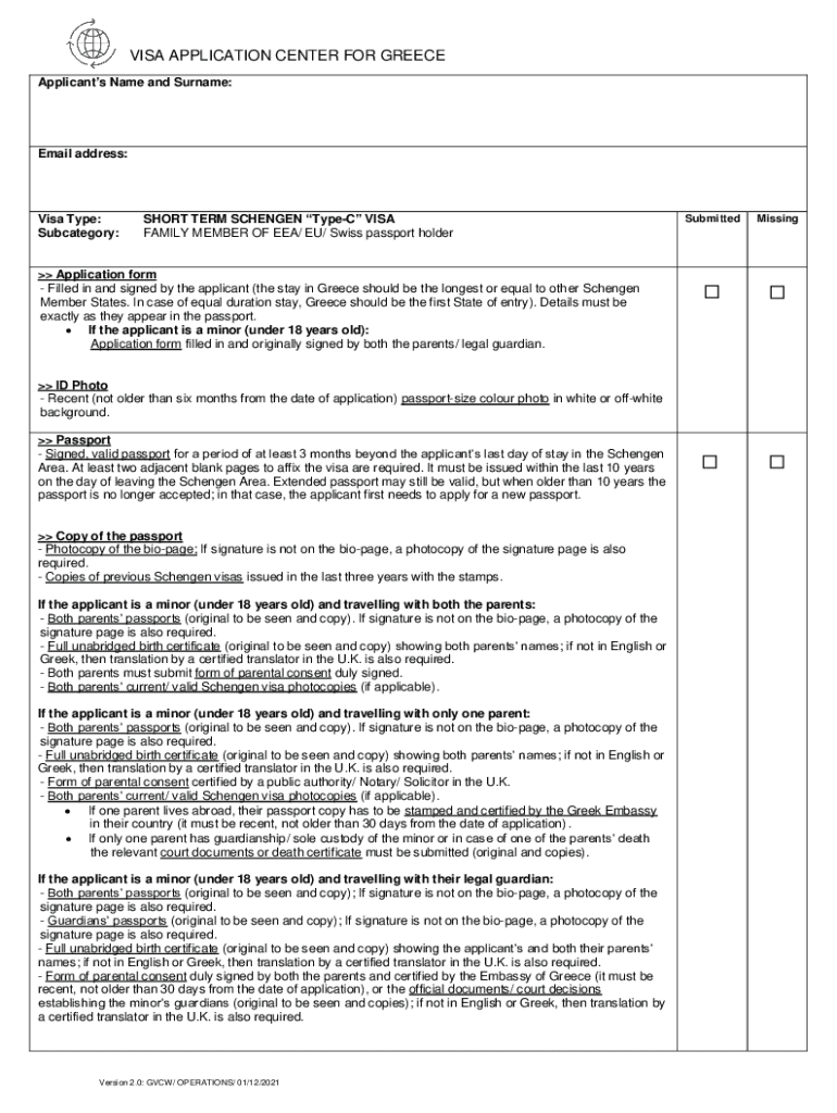 VISA APPLICATION CENTER FOR GREECE Applicants Name and Surname:Email address:Visa Type: Subcategory:SHORT TERM SCHENGEN Type VISA FAMILY MEMBER OF EEA/ EU/ Swiss passport holder Application form Filled