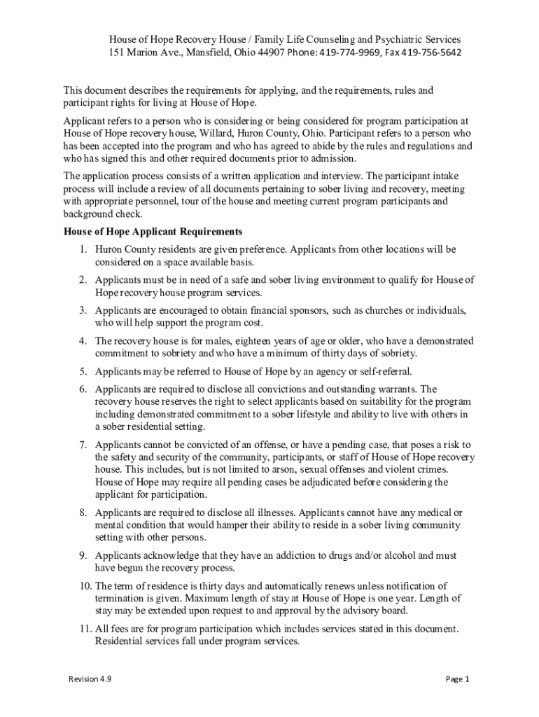 House of Hope Recovery House / Family Life Counseling and Psychiatric Services 151 Marion Ave., Mansfield, Ohio 44907 Phone: 4197749969, Fax 4197565642 This document describes the requirements for