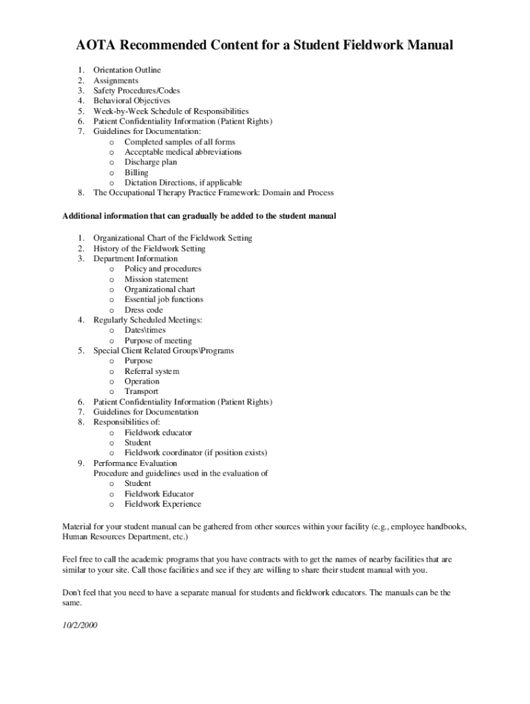 ALTA Recommended Content for a Student Fieldwork Manual 1. 2. 3. 4. 5. 6. 7.8. Orientation Outline Assignments Safety Procedures/Codes Behavioral Objectives WeekbyWeek Schedule of Responsibilities