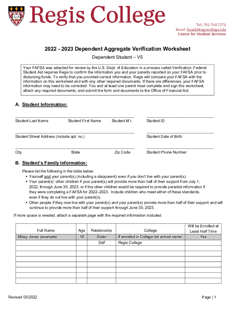 Tel: 781.768.7270 Email: finaid@regiscollege.edu Center for Student Services2022 2023 Dependent Aggregate Verification Worksheet Dependent Student V5 Your FAFSA was selected for review by the U.S.