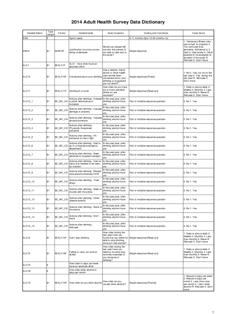 2014 Adult Health Survey Data Dictionary Variable Name Retype LengthFormat8Variable labelScript Questionable in yearsAIN$$141AIN14FJustification for proxy survey being undertakenALC$$11CALC1FALC1