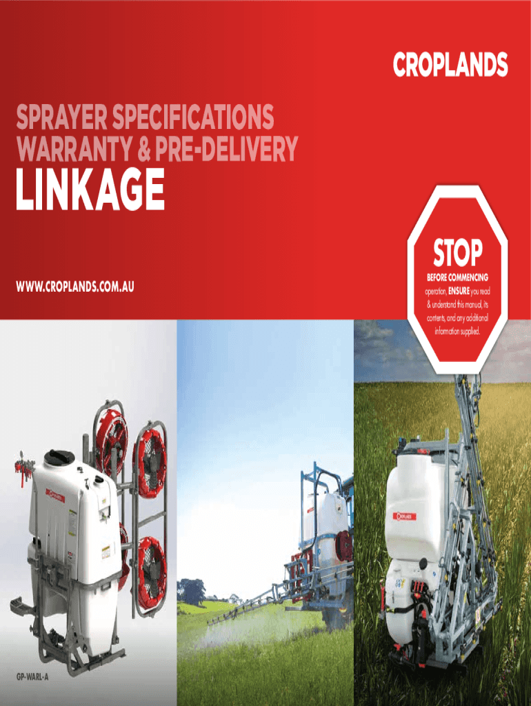 SPRAYER SPECIFICATIONS WARRANTY & PREDELIVERYLINKAGE WWW.CROPLANDS.COM.AU1 PEARL GPWARLASTOPBEFORE COMMENCING operation, ENSURE you read & understand this manual, its contents, and any additional