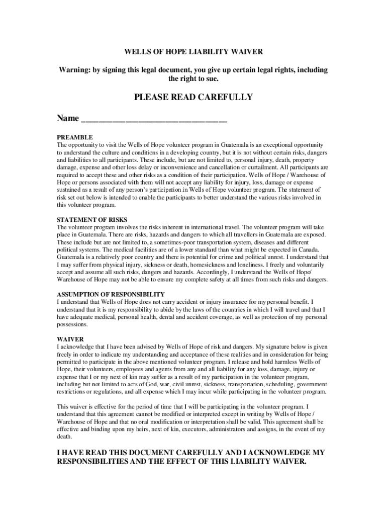 Get the free WELLS OF HOPE / WAREHOUSE OF HOPE LIABILITY WAIVER