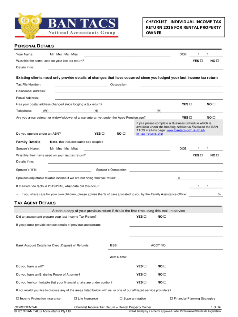 CHECKLIST INDIVIDUAL INCOME TAX RETURN 2016 FOR RENTAL PROPERTY OWNER PERSONAL DETAILS Your Name:Mr | Mrs | Ms | MissDOB://YES Was this the name used on your last tax return?NO Details if no:Existing