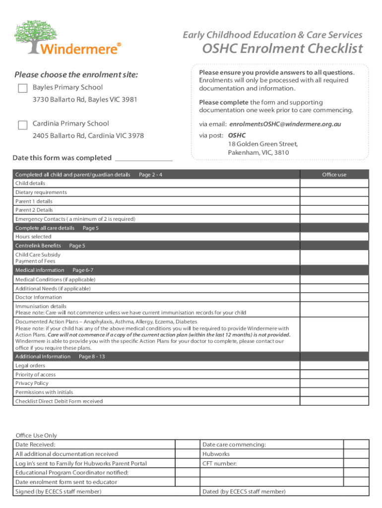 Early Childhood Education & Care ServicesOSHC Enrollment ChecklistPlease ensure you provide answers to all questions. Enrollments will only be processed with all required documentation and information.