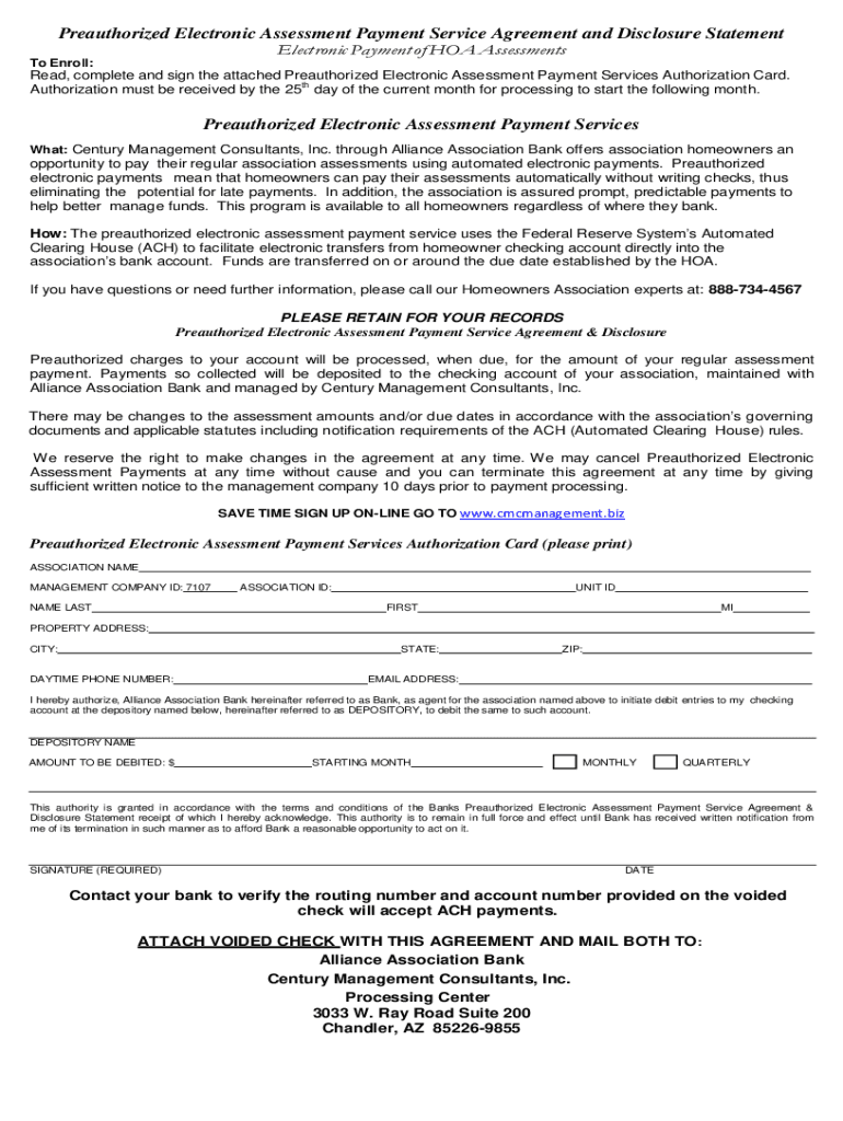 Preauthorized Electronic Assessment Payment Service Agreement and Disclosure Statement Electronic Payment of HOA Assessments Enroll:Read, complete and sign the attached Preauthorized Electronic Assessment