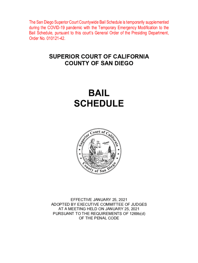 The San Diego Superior Court Countywide Bail Schedule is temporarily supplemented during the COVID-19 pandemic with the Temporary Emergency Modification to the Bail Schedule, pursuant to this courts