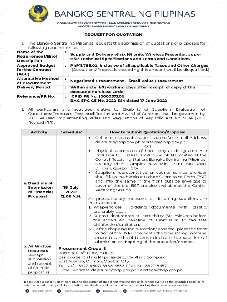 1. The Bangkok Central NG Filipinas requests the submission of quotations or proposals